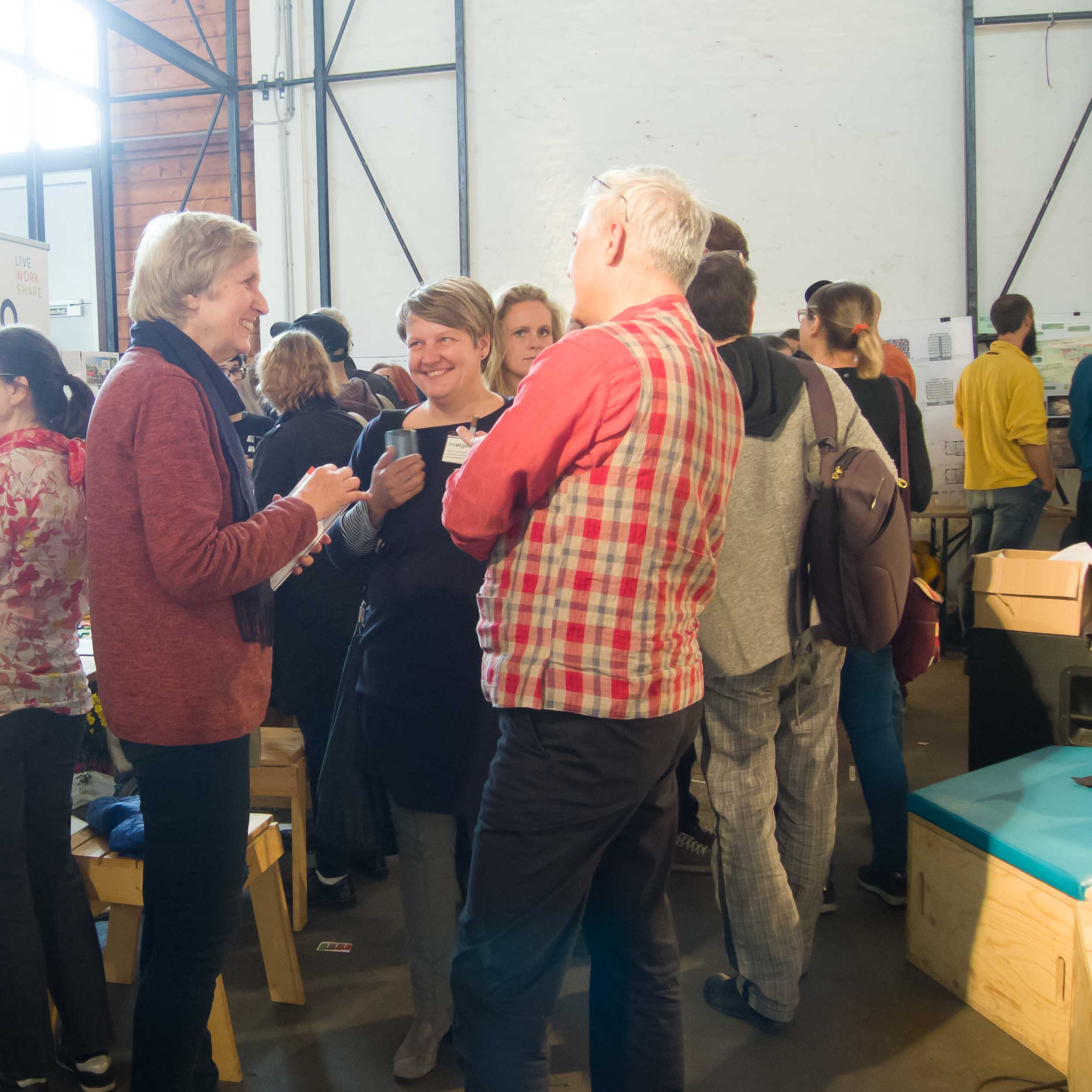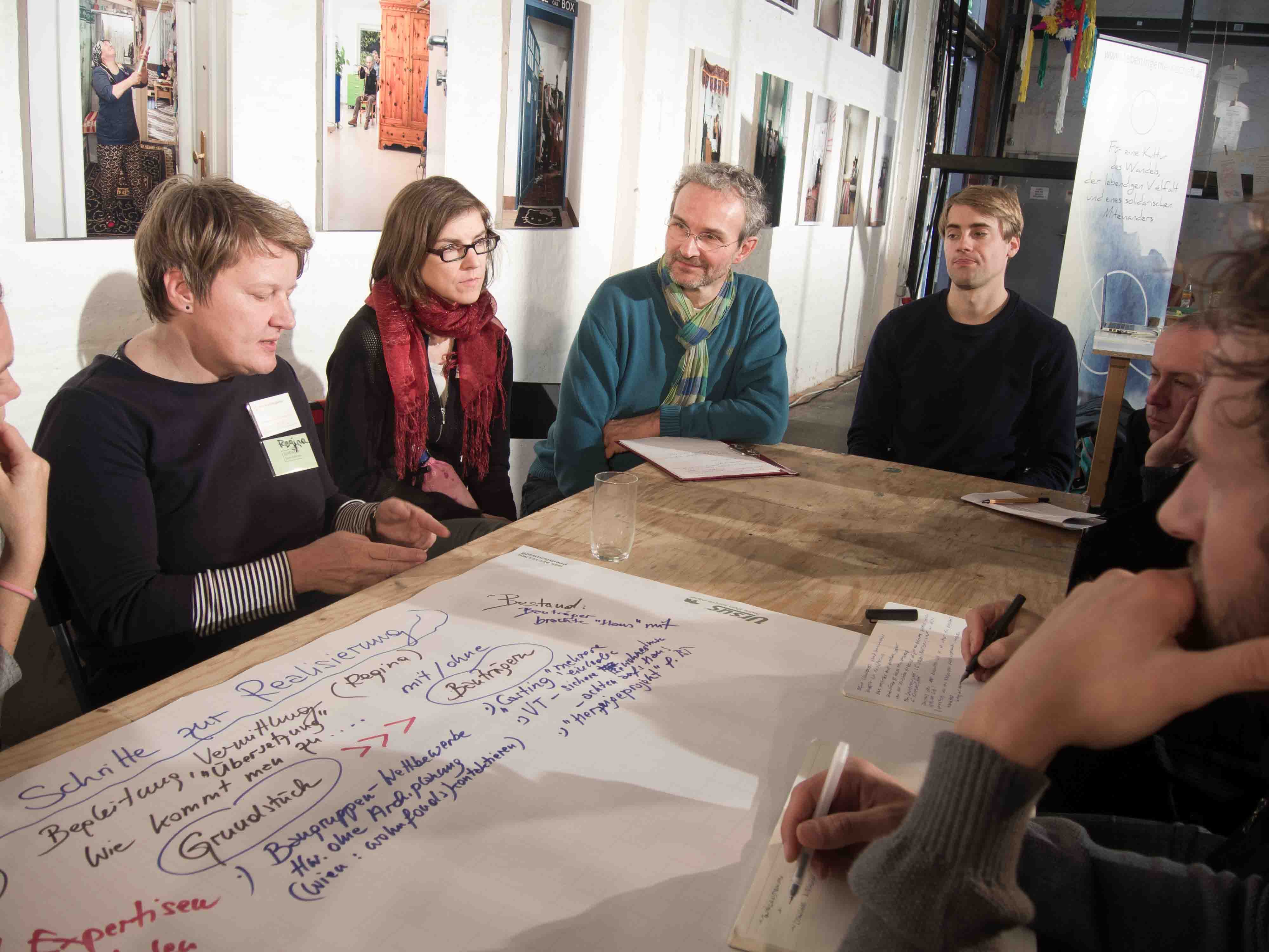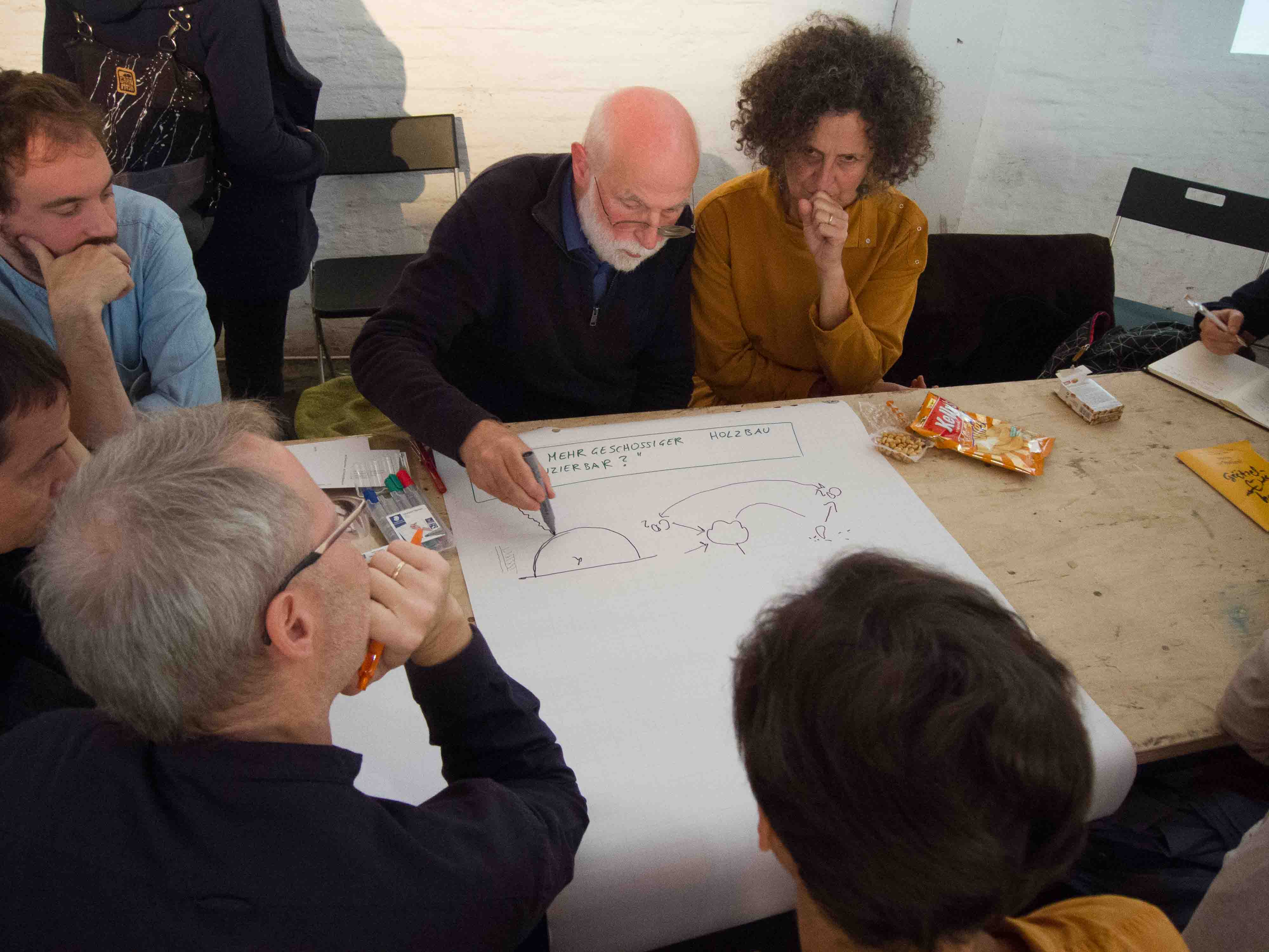 Nach einer Kurzvorstellung aller weiteren, vertretenen Projekte gab’s eine dreiviertel Stunde lang bei Snacks die Möglichkeit, persönlich mit den Gruppen in Kontakt zu treten. Zum Abschluss wurden an an Workshop-Inseln die Themen „Arbeiten in und mit selbst – organisierten Gruppen“, „Wir verwalten unser Haus“, „Vorausschauend in die Umsetzung“, „Ist mehrgeschossiger Holzbau finanzierbar?“ und „das habiTAT-Modell“ diskutiert. Die Expertise kommt von erfahrenen ExpertInnen, vom „Bureau für Selbstorganisierung„, vom habiTAT-Modell und natürlich von den anwesenden Wohn- und Hausprojekten selbst.