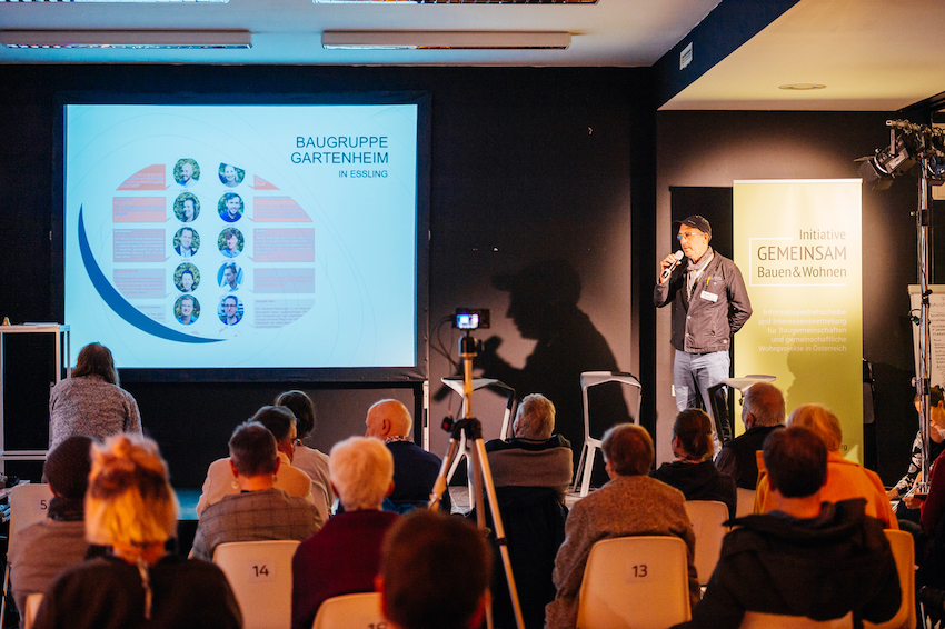 Elf neue Baugemeinschaften aus Wien und NÖ mit unterschiedlichen Konzepten präsentierten ihre Projekte. Sie informierten über freie Wohnungen und warben um Interessent*innen: