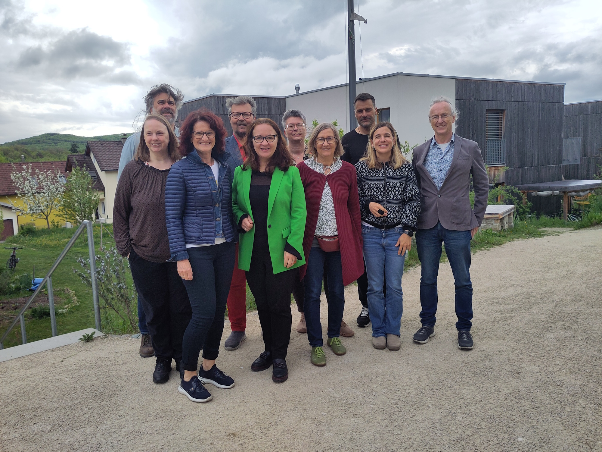 Die Klima- und Energiemodellregion Schwarzatal auf Tour zu Cohousing-Projekten in NÖ. Modellregionsmanagerin Katharina Fuchs (2. v. r.) lud Gemeindepolitiker:innen und Gemeindebedienstete zur Exkursion zu energie- und ressourcenschonenden Vorzeigeprojekten im Wohnbau im Kontext mit Selbstorganisation. Die Stationen: Wohnprojekt BROT-Pressbaum, wo VBGM Ingrid Burtscher von der Stadtgemeinde Pressbaum (3.v.l.) die Teilnehmer:innen begrüßte. Ralf Aydt (1.v.r) und Johanna Leutgöb (3.v.r) von der Initiative Gemeinsam Bauen und Wohnen begleiteten die Exkursion, bei der es auch reichlich Gelegenheit zum Austausch mit den Bewohner:innen gab. 2. Station Wohnprojekt Hasendorf (Gemeinde Sitzenberg-Reidling), 3. Station: Cohousing Pomali (Gemeinde Wölbling).
